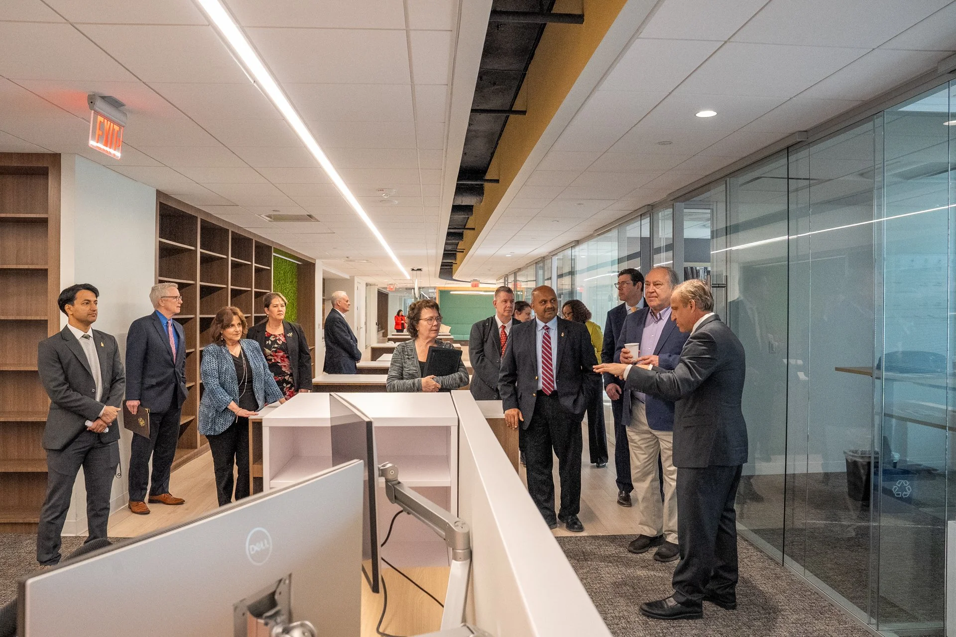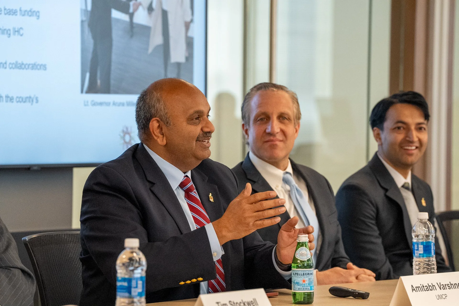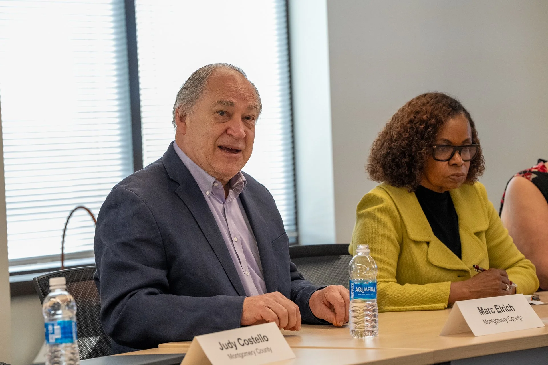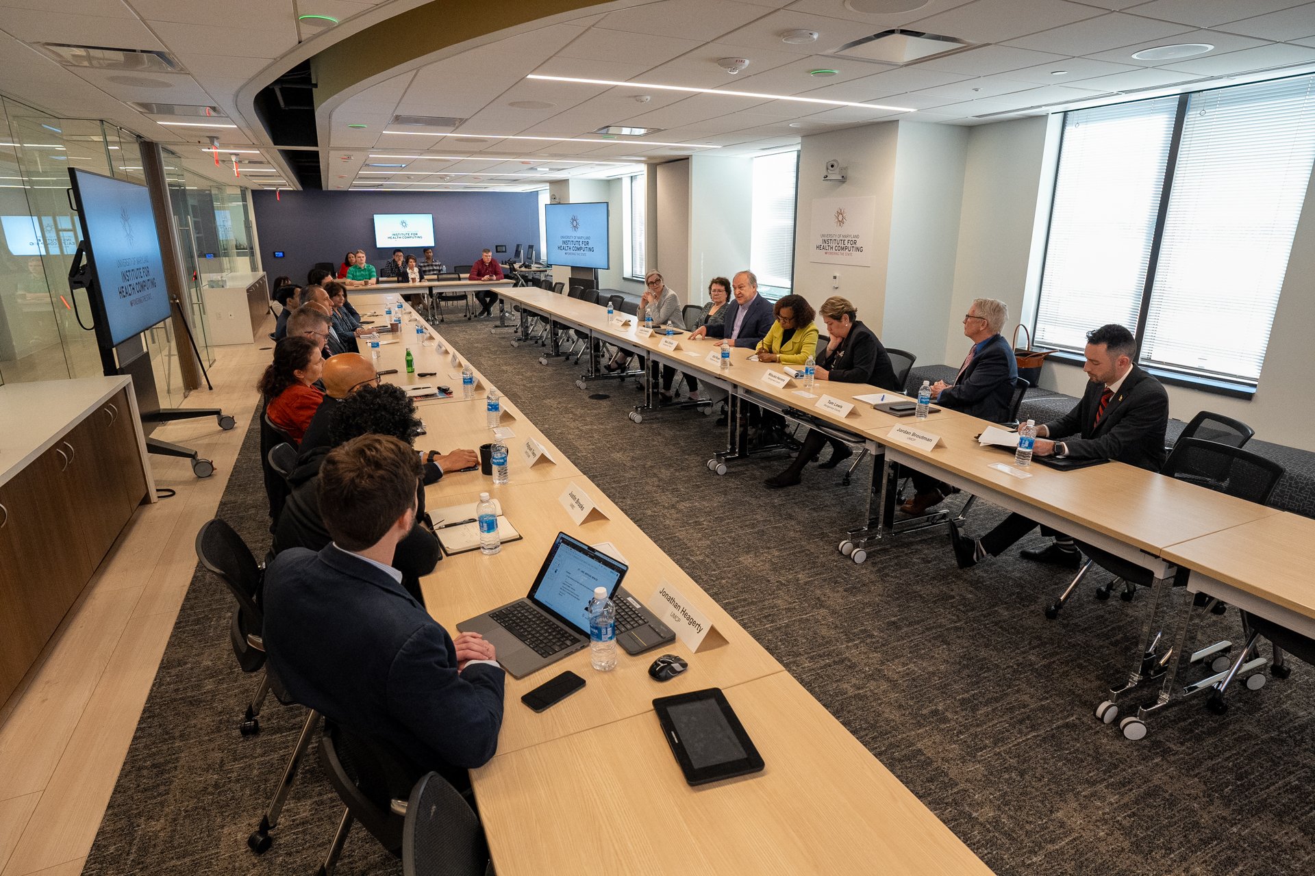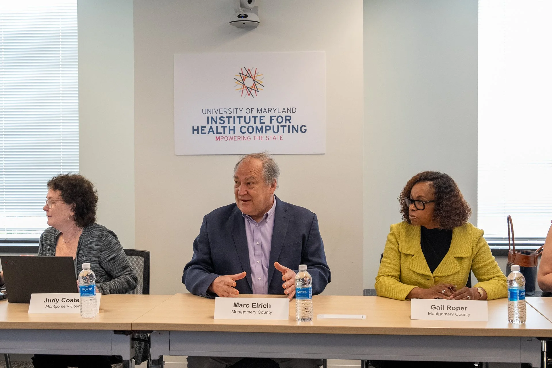The University of Maryland Institute for Health Computing (UM-IHC) hosted Montgomery County Executive Marc Elrich on Tuesday, April 23, 2024, in its new North Bethesda offices. Elrich and his team were joined by representatives from federal agency National Institutes of Health (NIH) and companies Kaiser Permanente, US Pharmacopeia and ThermoFisher.