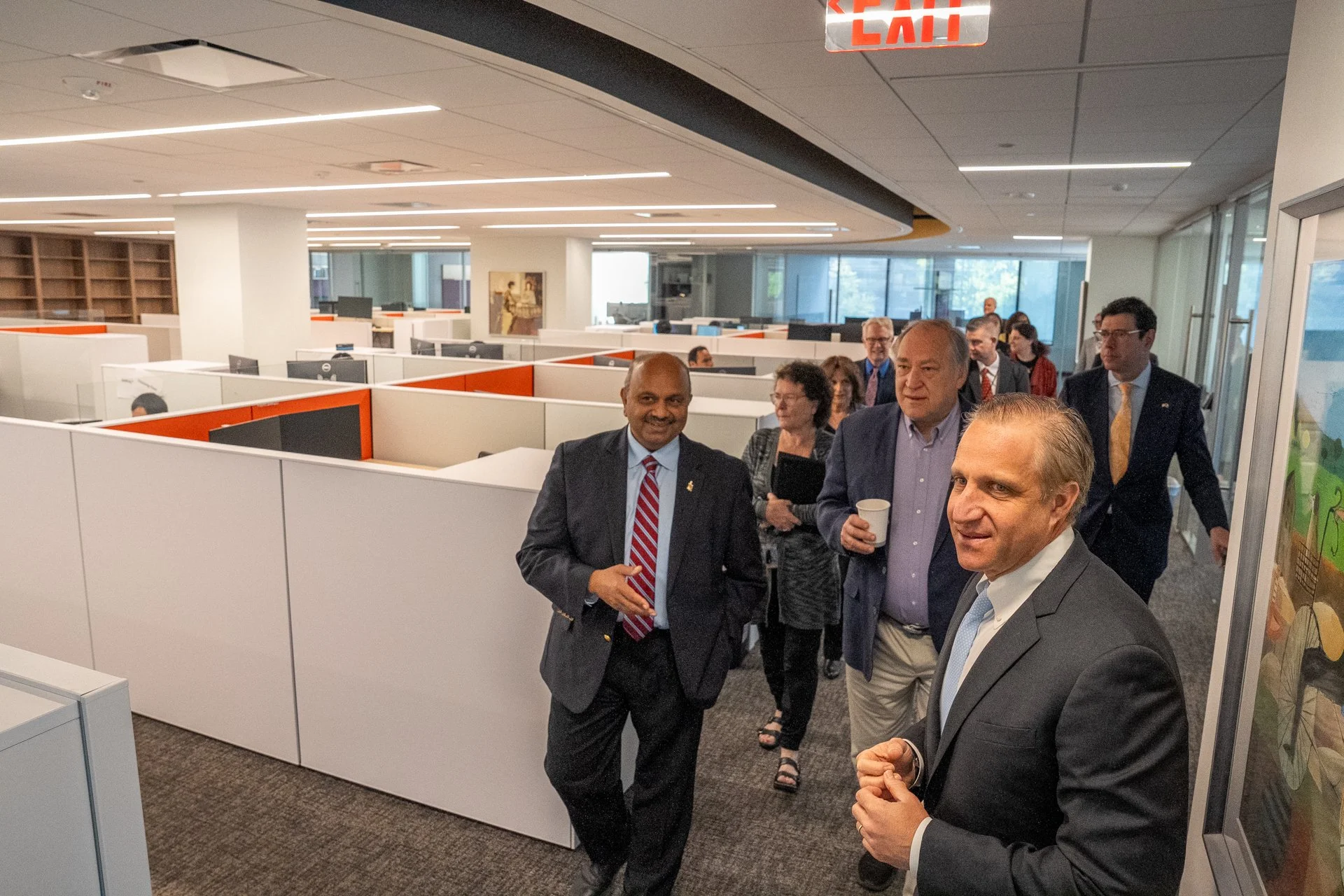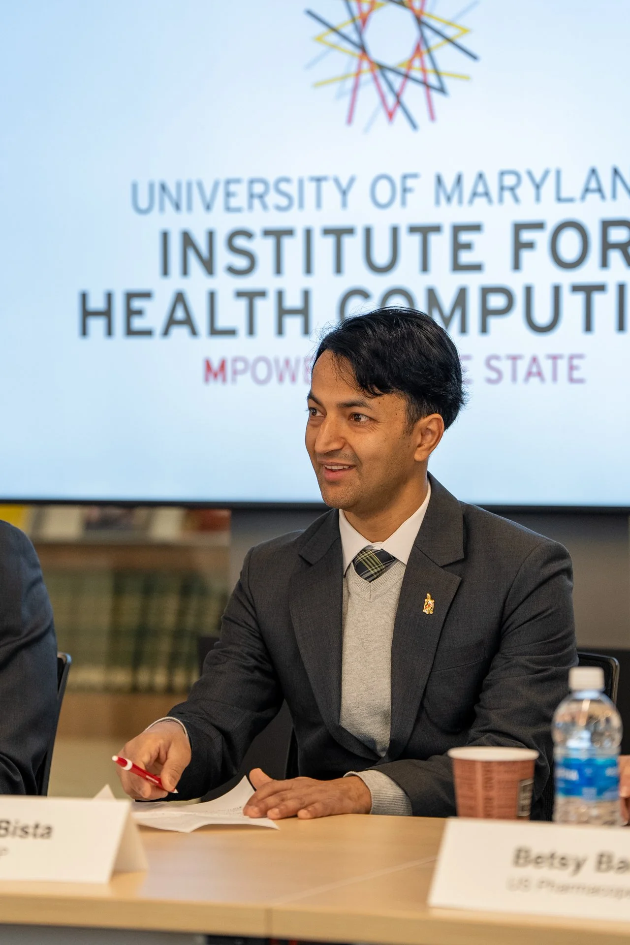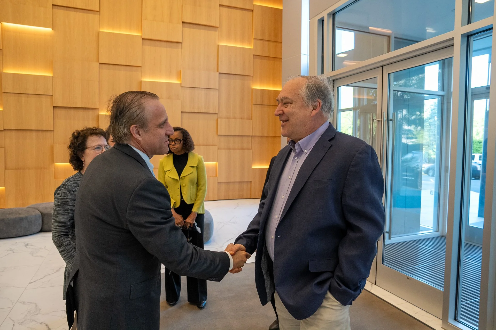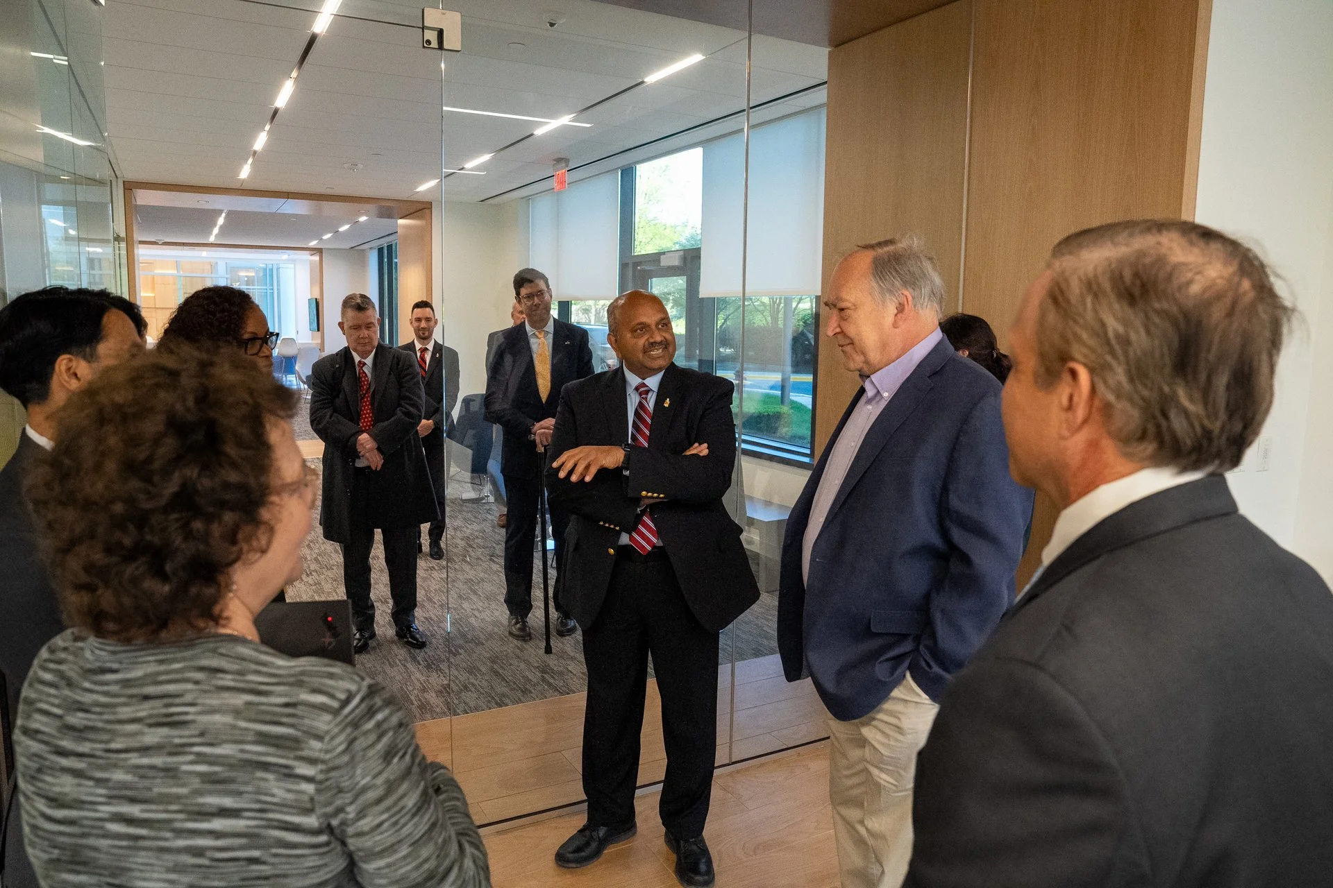 The University of Maryland Institute for Health Computing (UM-IHC) hosted Montgomery County Executive Marc Elrich on Tuesday, April 23, 2024, in its new North Bethesda offices. Elrich and his team were joined by representatives from federal agency National Institutes of Health (NIH) and companies Kaiser Permanente, US Pharmacopeia and ThermoFisher.